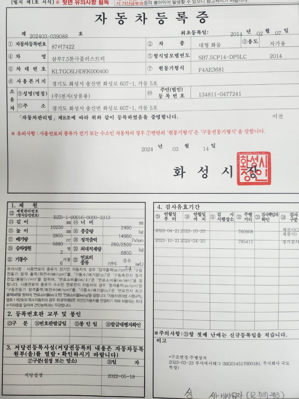 연식 / 톤수 2014년 02월 / 7.5 톤