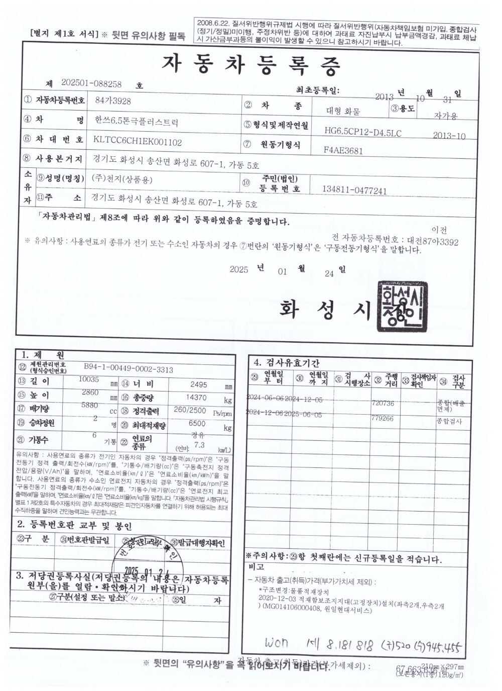 연식 / 톤수 2013년 10월 / 6.5 톤