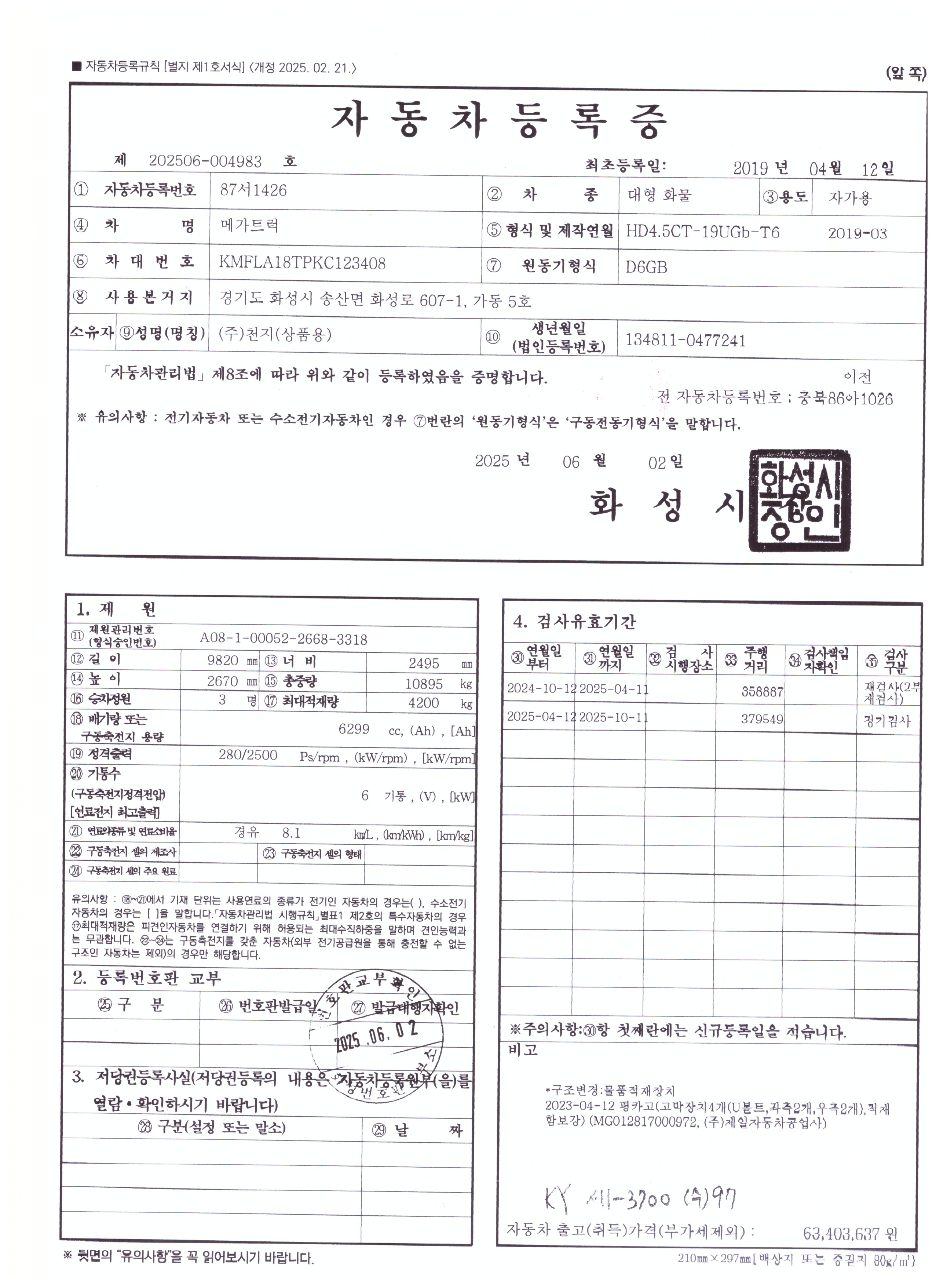 ◆◆ 주요제원 및 옵션 상세설명 ◆◆ ※ 제시신고번호 : 20251261048 ■ 차명 : 메가4.5톤평판카고트럭 ■ 차량번호 : 87서1426 ■ 연식 : 2019년04월 ■ 주행거리 : 38만 km ■ 길이7m40.280마력 ■ 압류 및 저당 없음 ♡ 정직과 신용을 최우선으로 생각합니다. ♡ 최고 보다는 고객님에게 최선을 다 하는 딜러가 되고자 합니다. ♡ 고객님의 편의를 위하여 휴일에도 근무하오니 언제든지 전화주십시요. ♡ 대차 / 캐피탈할부가능합니다. ♡ 안전 운행하시고 돈 많이 많이 버십시요. ♡ 화물차 전문 딜러 ☎010 8957 2066 이 병 철. ★ 사업자 등록번호 : 232-81-04733 주식회사 천지 ★ 자동차관리사업 등록번호 : 02-4123-000373 ★ 자동차 매매 사원증 번호 : GC25-02524 ▶ 오시는 길 ◀ 사무실 주소: 경기도 화성시 화성로 607-1 차고지 주소: 경기도 화성시 삼존로 133 |