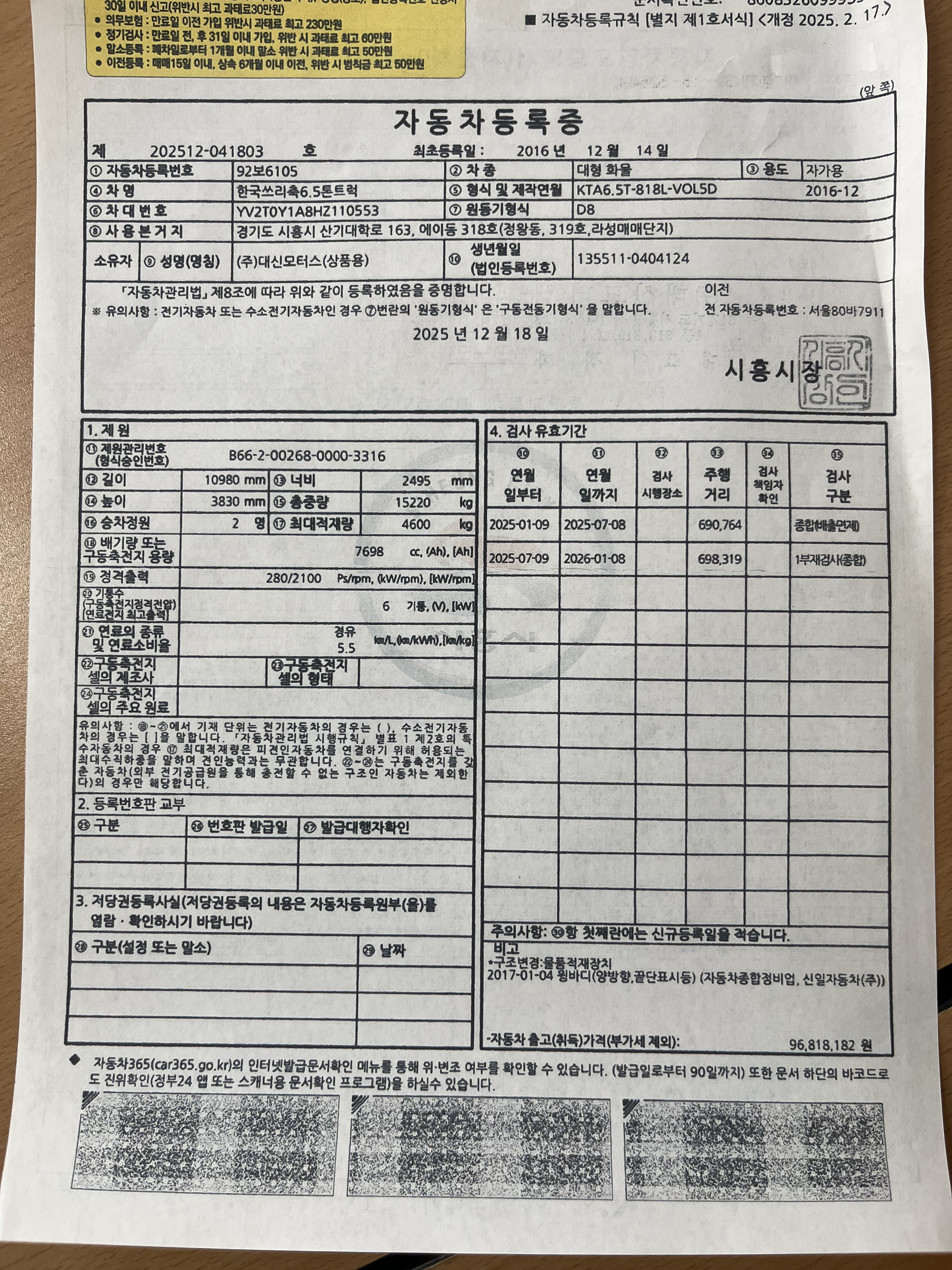연식 / 톤수 2016년 12월 / 6.5 톤
