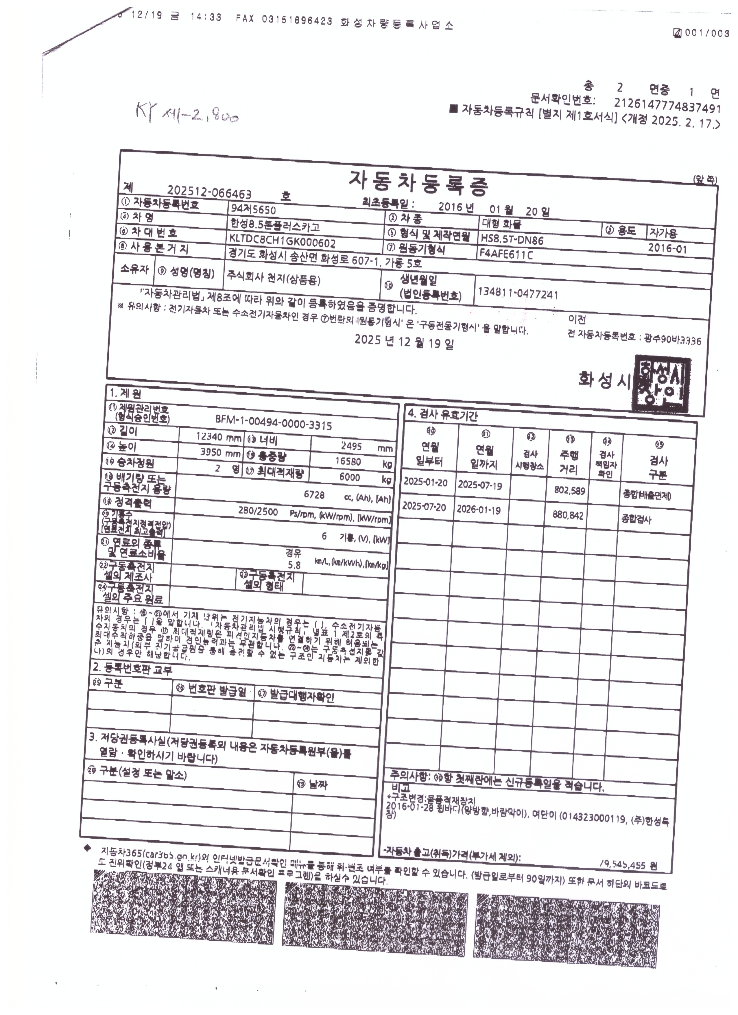 연식 / 톤수 2016년 01월 / 8.5 톤