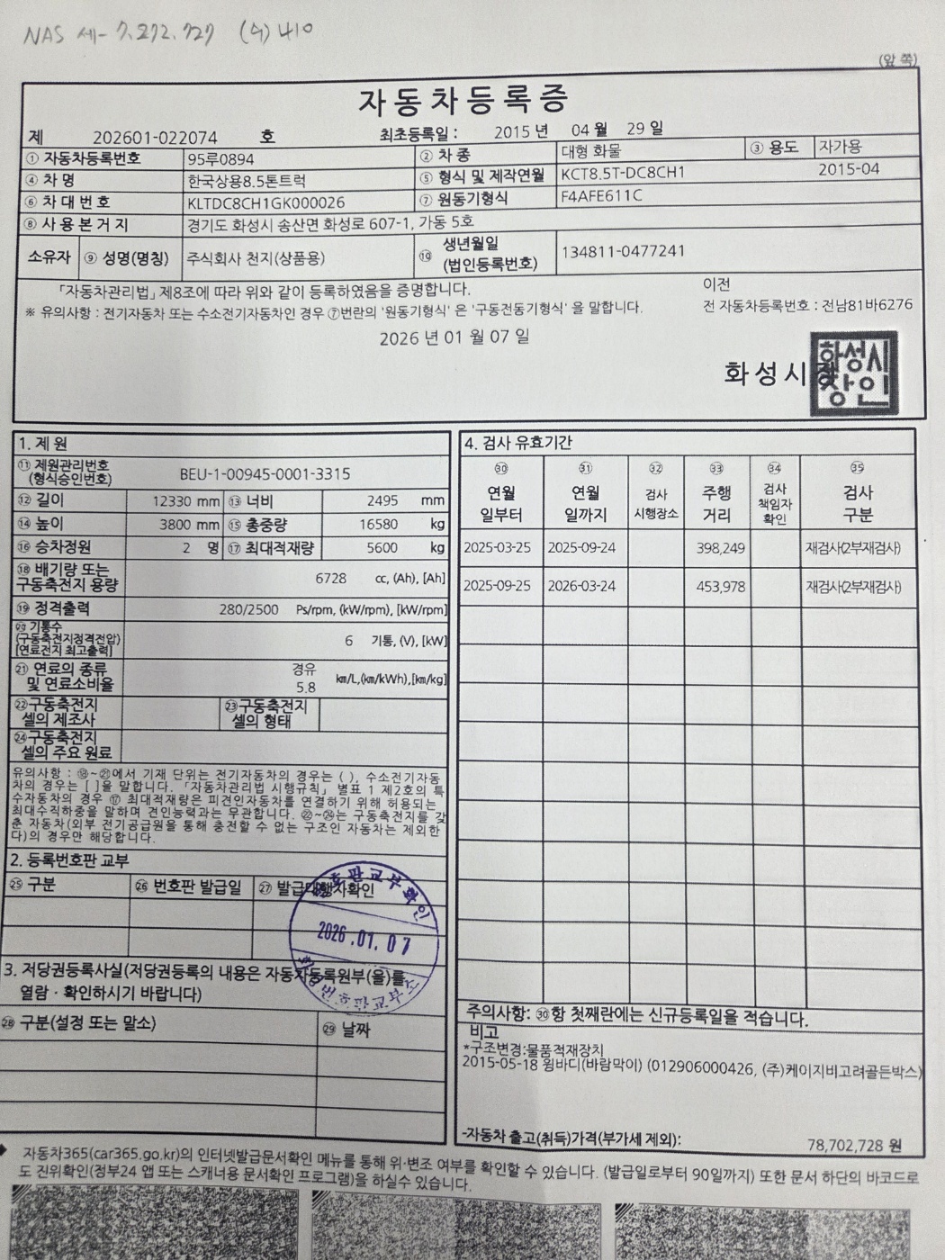 ◆◆ 주요제원 및 옵션 상세설명 ◆◆ ※ 제시신고번호 : 20261008606 ■ 차명 : 노부스8.5톤후축윙바디 ■ 차량번호 : 95루0894 ■ 연식 : 2015년04월 ■ 주행거리 : 145만km ■ 무시동히터&에어컨,9m60*2m50*2m40,280마력 ■ 압류 및 저당 없음 ■ 매매알선(천지) ♡ 정직과 신용을 최우선으로 생각합니다. ♡ 최고 보다는 고객님에게 최선을 다 하는 딜러가 되고자 합니다. ♡ 고객님의 편의를 위하여 휴일에도 근무하오니 언제든지 전화주십시요. ♡ 대차 / 캐피탈할부가능합니다. ♡ 안전 운행하시고 돈 많이 많이 버십시요. ♡ 화물차 전문 딜러 ☎010 8957 2066 이 병 철. ★ 사업자 등록번호 : 232-81-04733 주식회사 천지 ★ 자동차관리사업 등록번호 : 02-4123-000373 ★ 자동차 매매 사원증 번호 : GC25-02524 ▶ 오시는 길 ◀ 사무실 주소: 경기도 화성시 화성로 607-1 차고지 주소: 경기도 화성시 삼존로 133 |