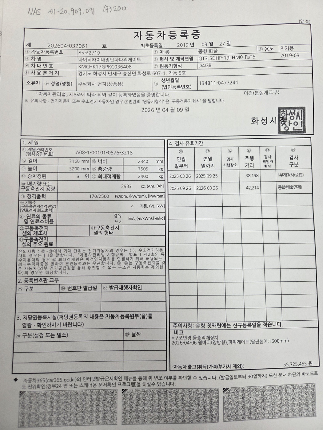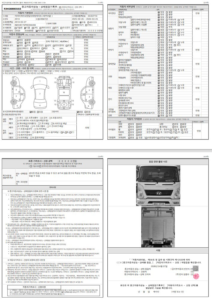 ◆◆ 주요제원 및 옵션 상세설명 ◆◆ ※ 제시신고번호 : 20261117232 ■ 차명 : 올뉴마이티3.5톤새윙바디 ■ 차량번호 : 85모2719 ■ 연식 : 2019년03월 ■ 주행거리 : 4만km ■ 리프트,4m70*2m20*2m24(파렛트8장),슈퍼캡,170마력 ■ 압류 및 저당 없음 ■ 매매알선(천지) ♡ 정직과 신용을 최우선으로 생각합니다. ♡ 최고 보다는 고객님에게 최선을 다 하는 딜러가 되고자 합니다. ♡ 고객님의 편의를 위하여 휴일에도 근무하오니 언제든지 전화주십시요. ♡ 대차 / 캐피탈할부가능합니다. ♡ 안전 운행하시고 돈 많이 많이 버십시요. ♡ 화물차 전문 딜러 ☎010 8957 2066 이 병 철. ★ 사업자 등록번호 : 232-81-04733 주식회사 천지 ★ 자동차관리사업 등록번호 : 02-4123-000373 ★ 자동차 매매 사원증 번호 : GC25-02524 ▶ 오시는 길 ◀ 사무실 주소: 경기도 화성시 화성로 607-1 차고지 주소: 경기도 화성시 삼존로 133 |